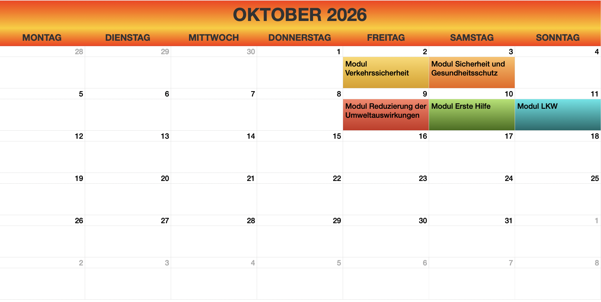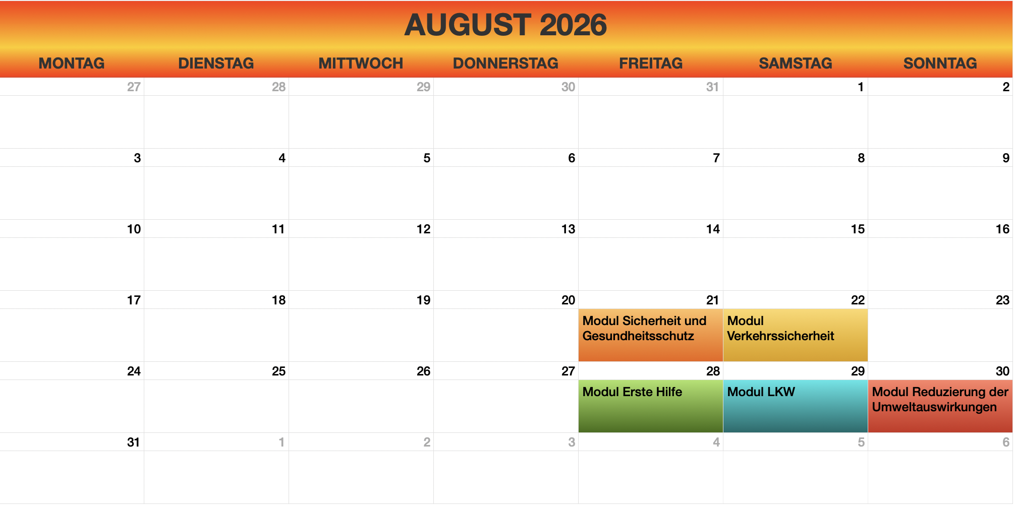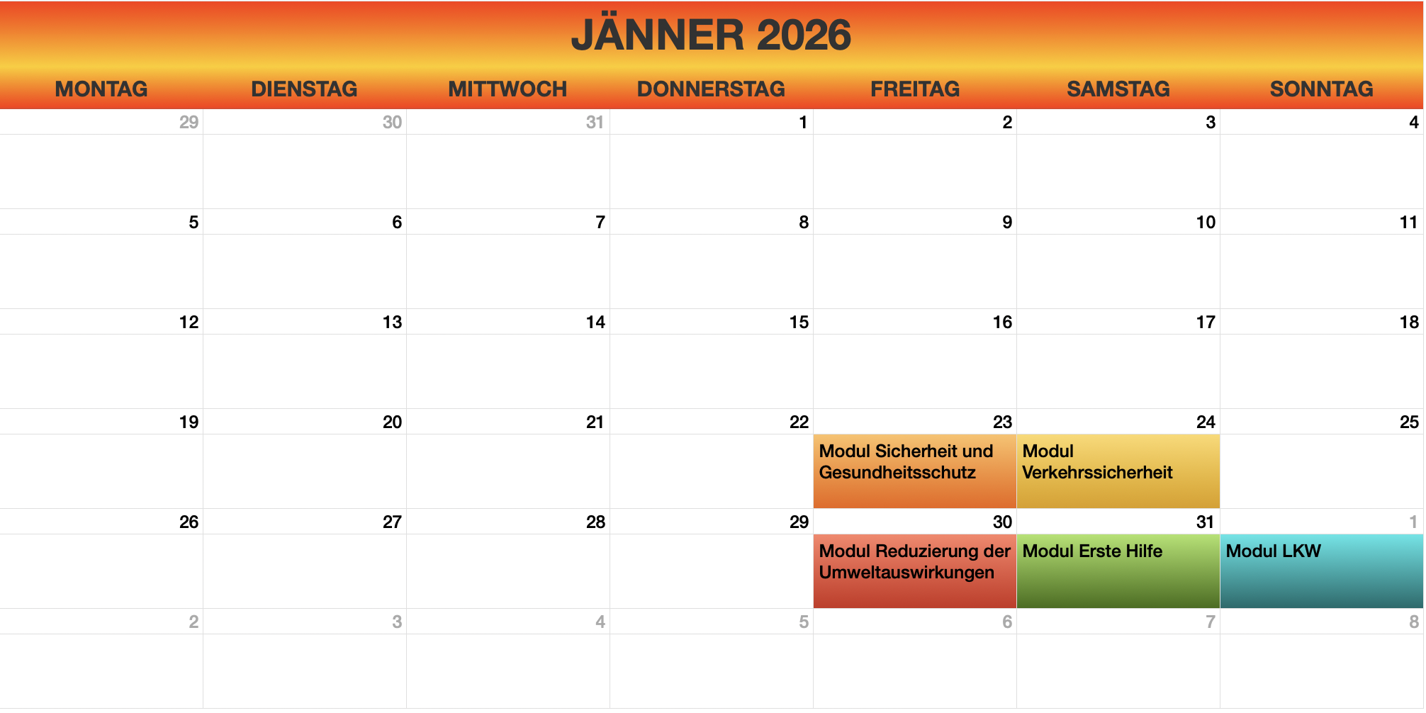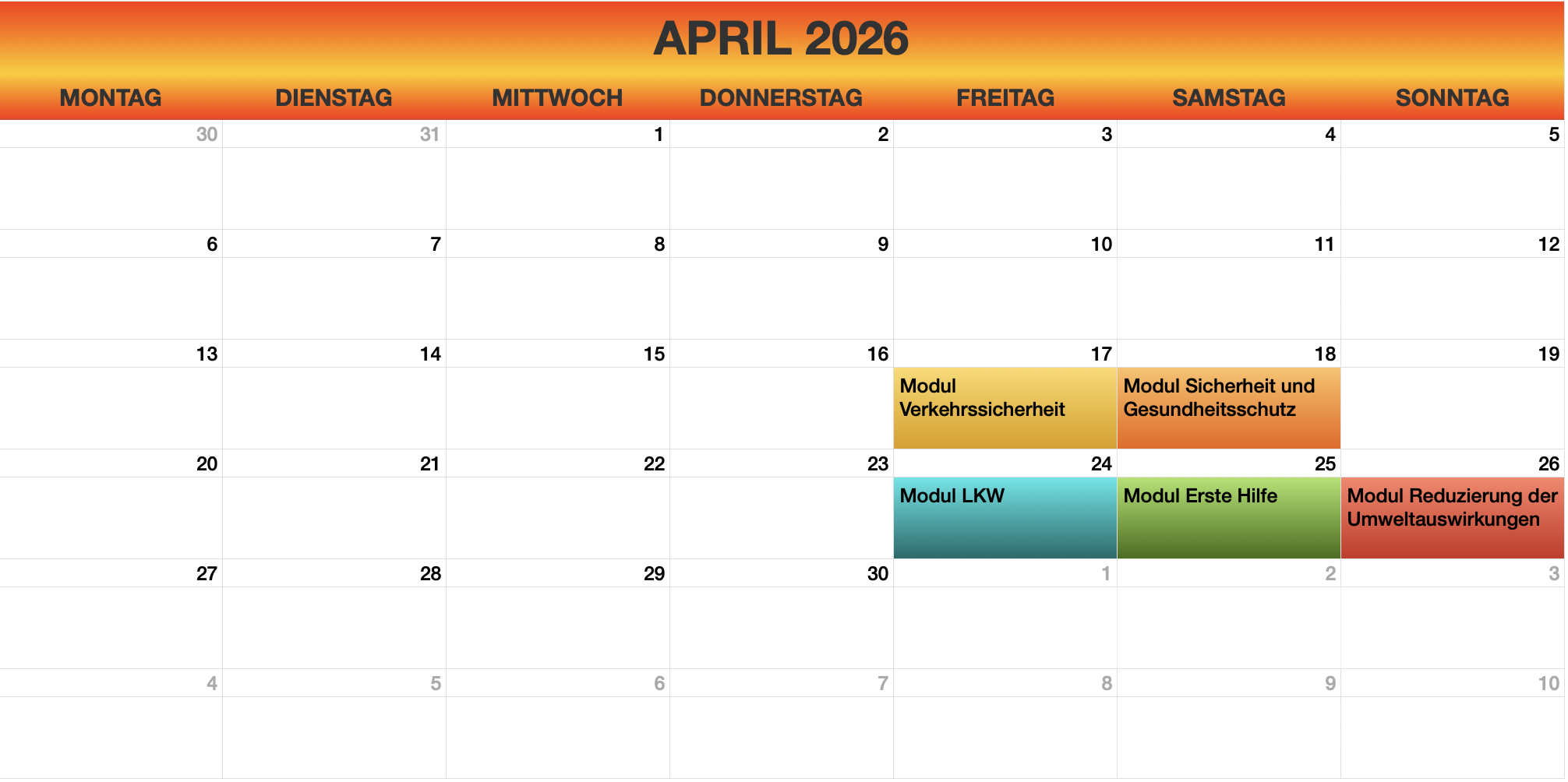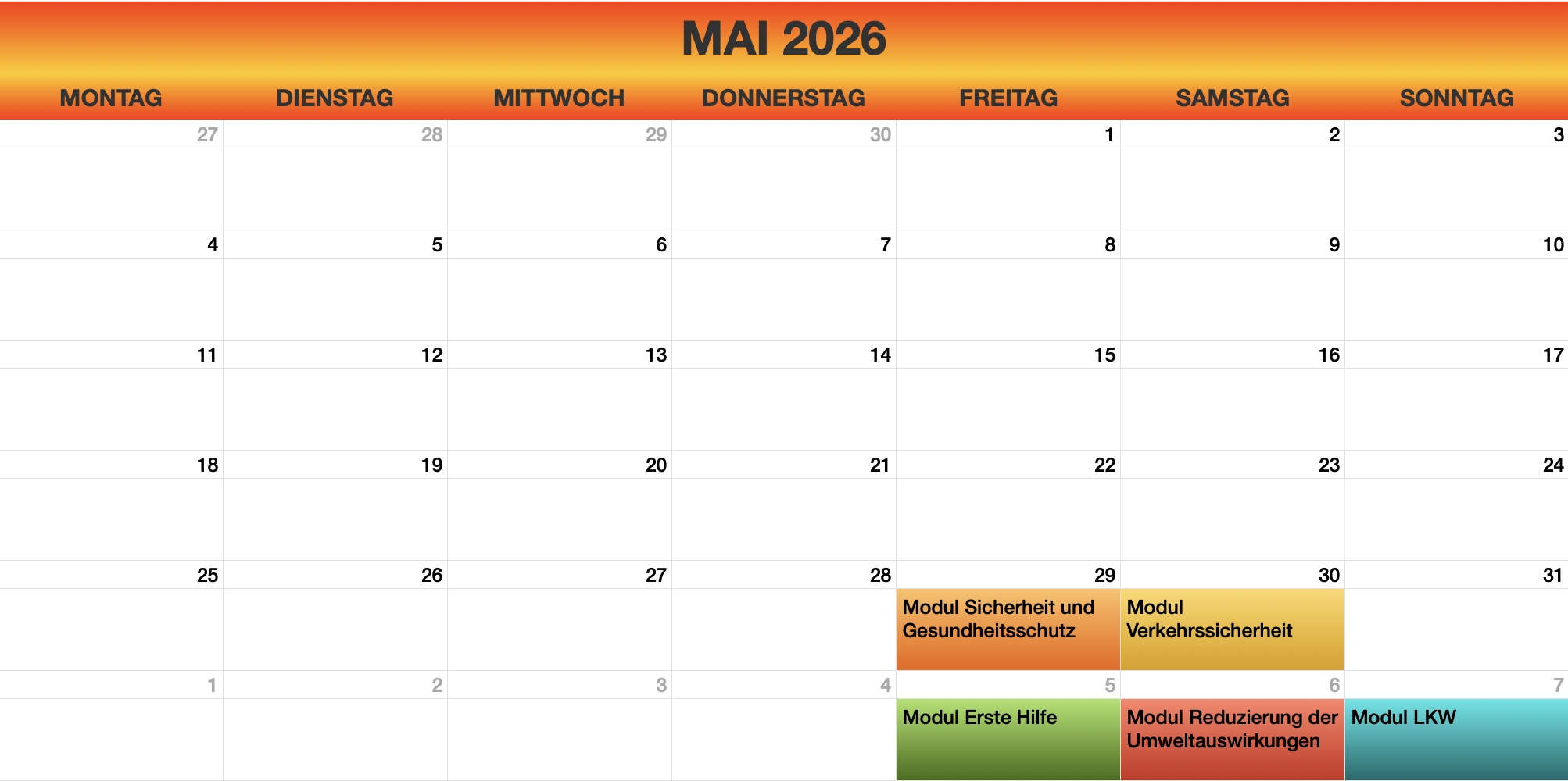 - Sprachkurse: Diese Kurse sind für Kraftfahrer relevant, die im internationalen Transport tätig sind.