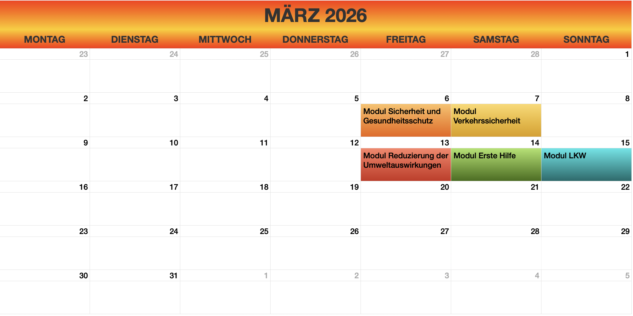 - Gefahrguttransport (ADR): Diese Weiterbildungen sind für Kraftfahrer erforderlich, die gefährliche Güter transportieren. Sie vermitteln Kenntnisse über die spezifischen Vorschriften und Sicherheitsmassnahmen beim Transport von Gefahrgut.