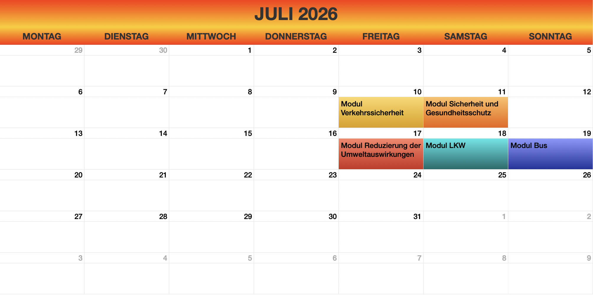 - Weiterbildungen gemäss GWB: Diese Weiterbildungen sind gesetzlich vorgeschrieben und müssen alle fünf Jahre absolviert werden. Sie umfassen Themen wie Verkehrssicherheit, इकोnomiches Fahren und rechtliche Bestimmungen.