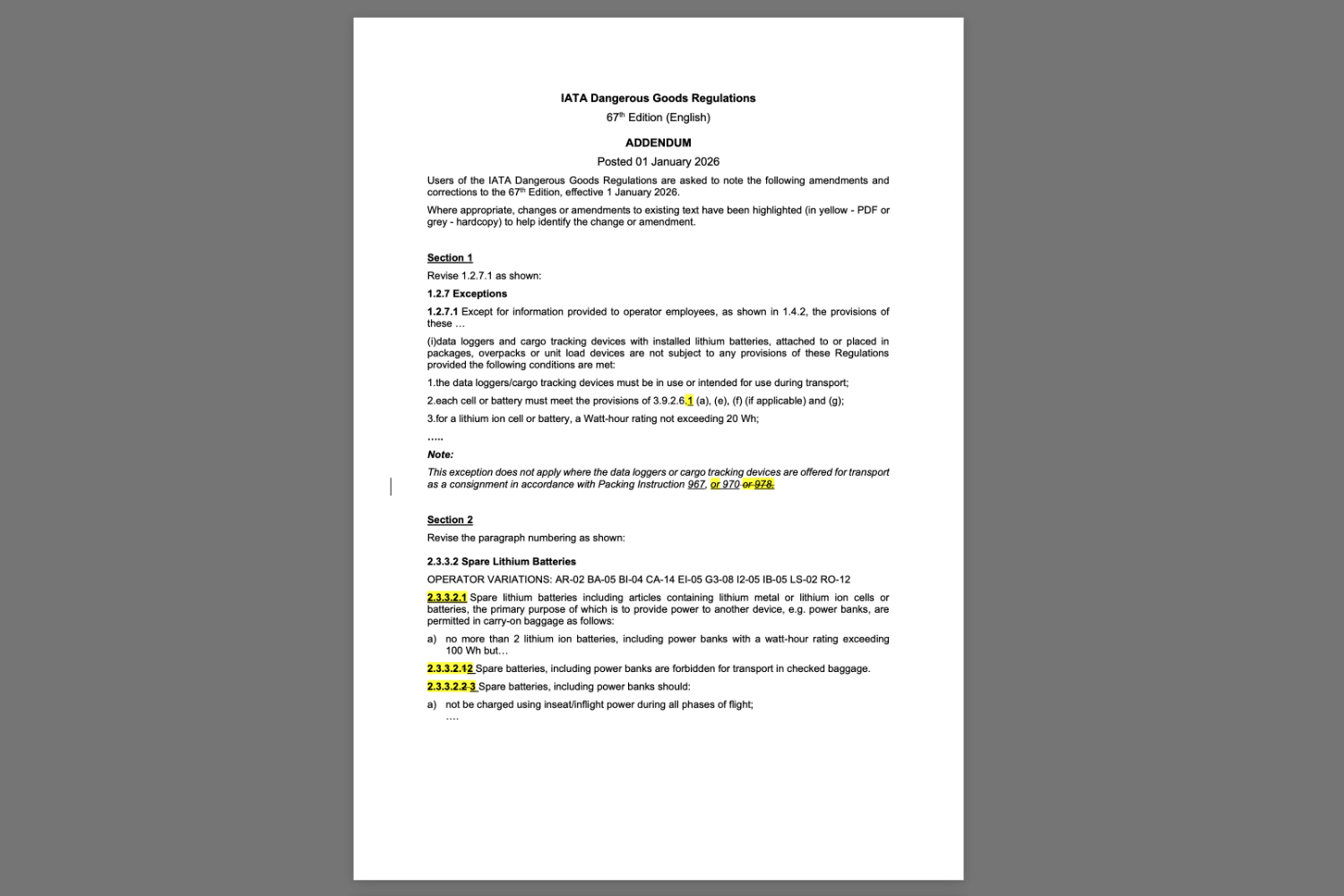 Die Regeln zu Lithium Batterien werden In jeder Ausgabe der IATA-DGR geändert. Besonders in der 66. Ausgabe fällt auf, dass nun auch Lithium-Ionen-Batterien, die mit Ausrüstung verpackt sind (UN 3481), von Begrenzungen des Ladezustands betroffen sind. Für das Jahr 2025 wird empfohlen, dass Batterien mit einer Nennenergie über 2,7 Wh maximal mit 30 Prozent Ladezustand transportiert werden sollen. Ab 2026 wird diese Empfehlung verpflichtend.
